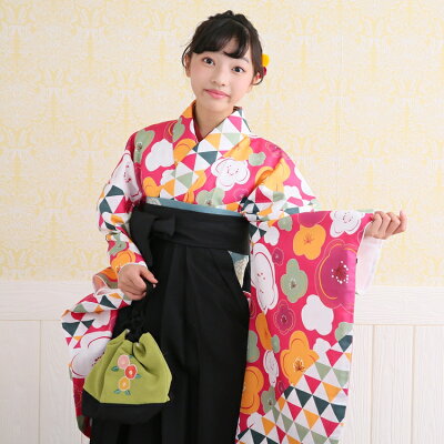 【リサイクル着物セット】 2尺袖 袴 2点セット 袴84cm(身長145-150cm) 国内染色 日本製生地 ジュニア 小学生 花 販売 購入 ピンク子供 kids マゼンタ 緑 紺 うろこ 鱗 梅 古典柄 大正浪漫 ヴィンテージ アンティーク USED 中古 古着 卒業式 謝恩会